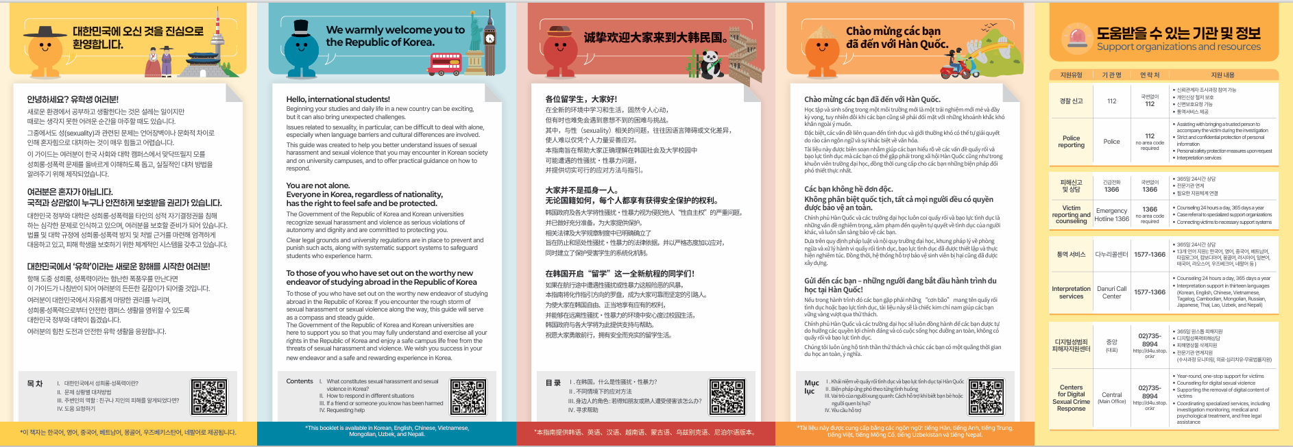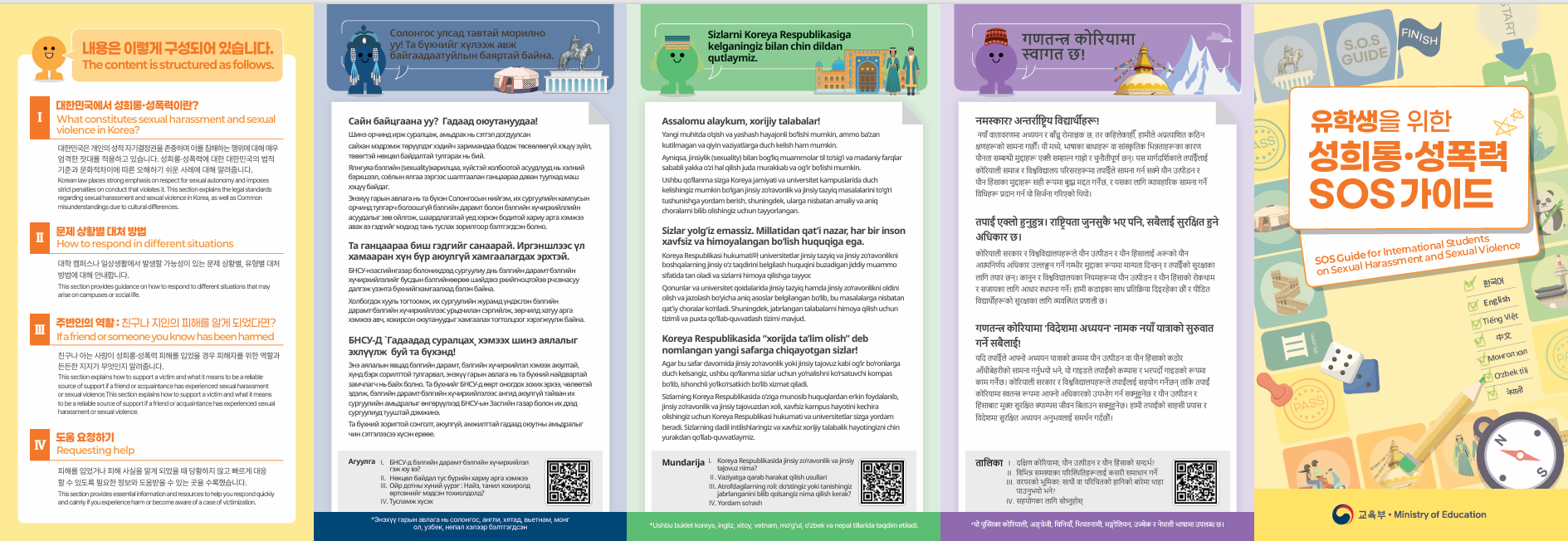 외국인 유학생을 위한 「성희롱·성폭력 SOS 가이드」안내 리플릿입니다. QR코드를 찍어 가이드의 내용을 확인해보세요!
