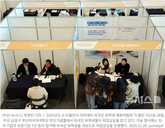 [서울=뉴시스]권신혁 기자 = 앞으로 국내 대학을 졸업한 외국인 유학생이 정부 운영 '일학습병행'을 이수하면 별도 경력이 없어도 전공에 상관없이 취업이 가능해진다.고용노동부는 법무부와 5일 오전 '외국인 직업능력개발 지원방안' 간담회를 개최했다.양 부처는 이날 간담회에서 외국인 유학생 일학습병행제도를 중점적으로 다뤘다. 유학생이 국내 대학을 다니면서 직업훈련까지 함께 받는 제도다.우선 노동부와 법무부는 현행 취업비자(E-7)를 개선한다.기존엔 해당 비자를 취득하려면 국내 전문대 졸업의 경우 1년 이상 경력이 필요했다.정부는 일학습병행 훈련을 이수한 유학생은 경력이 없어도 전공 무관하게 취업이 가능해지는 식으로 비자제도를 바꾼다.인력이 필요한 기업이 유학생을 원활히 채용해 지역 경제를 활성화하는 취지에서다.또 양 부처는 외국인 유학생뿐 아니라 고용허가제(E-9)로 입국해 일하고 있는 노동자에 대한 직업능력개발 방안도 마련할 계획이다.김영훈 노동부 장관은 "고용노동부는 외국인 숙련·안전을 위한 직업능력개발정책을 통해 우수외국인을 숙련인력으로 양성해 지역사회와 중소기업의 지속 성장에 기여하겠다"고 밝혔다.